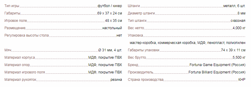 Корпус модели, игровое поле и опоры стола изготовлены из прочного материала МДФ и покрыты виниловой пленкой (ПВХ), предохраняющей поверхность от царапин.