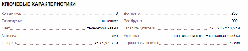 Киевница рассчитана на хранение 6 киев в правильном вертикальном положении. Кии подвешиваются на крюки с помощью резиновых держателей (держатели в комплект не входят). Над крюками имеется полка, на которую можно положить различные аксессуары (мелки, перчатки и пр.).