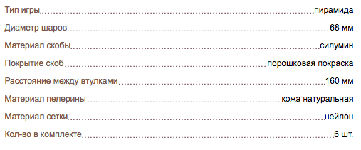 Комплект Классик B-3 включает шесть луз для бильярдных столов и набор для крепежа. Скобы луз изготовлены из силумина - сплава алюминия и кремния, обладающего наилучшими литейными свойствами. По своей прочности силумин превосходит сталь, но при этом значительно легче ее, поэтому материал часто используется в промышленном производстве, машиностроении. На скобы покрыты порошковой краской, пелерины луз изготовлены из натуральной кожи, сетки - из нейлона. Лузы предназначены для игры шарами диаметром 68 мм.
