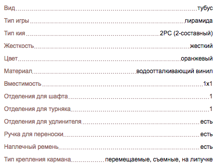 Надежный и удобный аксессуар для хранения и транспортировки одного двусоставного кия для русской пирамиды. Тубус оснащен большим количеством отделений разного формата: имеются как основные отделения для всех частей кия - для шафта, для турняка, для удлинителя, - так и дополнительные наружные карманы для различных бильярдных аксессуаров или просто необходимых мелочей.